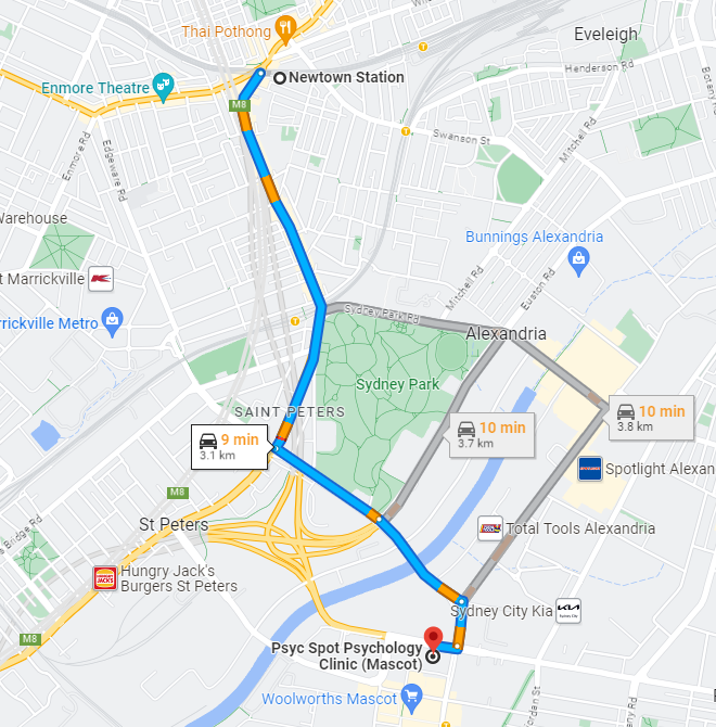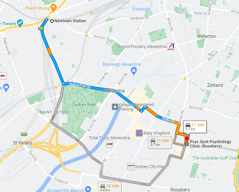 Both of our psychology practices are close to the suburb of Newtown in the Inner-West of Sydney. Our Mascot psychology clinic is just a 10-12min drive away, while our Rosebery psychology practice can be easily reached by public transport (bus 370) or a similarly short 13-15min drive. Free parking is available around both of our locations.