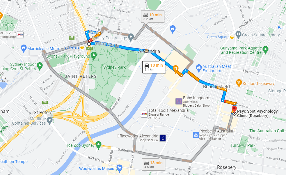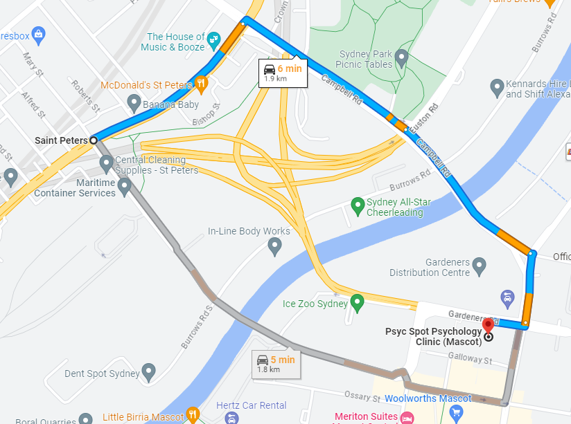 Our psychology practices are very close to St Peters in the Inner-West of Sydney. In particular, our Mascot psychology practice is located just outside the border of St Peters, and is only 5min drive away. Clients can also reach us by public transport via bus 358. Our Rosebery psychology practice is likewise very close to St Peters and can be reached with a quick 10min drive.