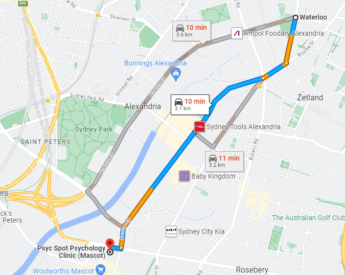 Our Rosebery psychology practice is particularly convenient for those living in Waterloo, as it is only about 2km away and can be reached by bus 309 and 343, or a short 6-10min drive through Botany Road or Joynton Avenue. Our Mascot is also just 3km and a short 8-12min drive away.