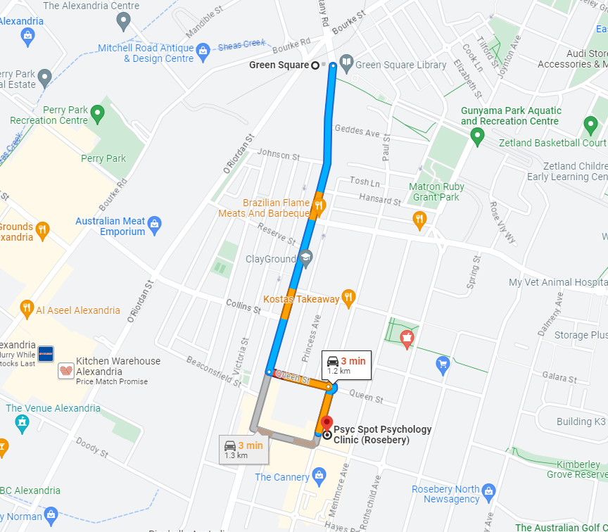 Both of our psychology practices are very close to Zetland in South Sydney. Our Rosebery practice is just a couple of bus stops or a very short drive away (e.g., from East Village Shopping Centre), and is even within walking distance from the southern part of Zetland (e.g., from Green Square Library and Infinity Square). Our Mascot practice is only one stop away from Green Square Train Station, so it is likewise reachable within minutes.